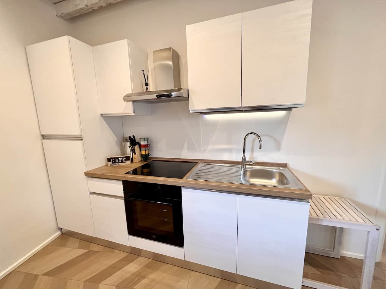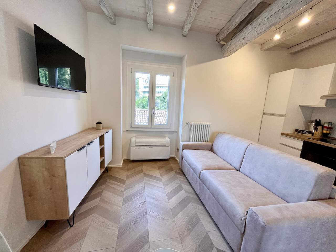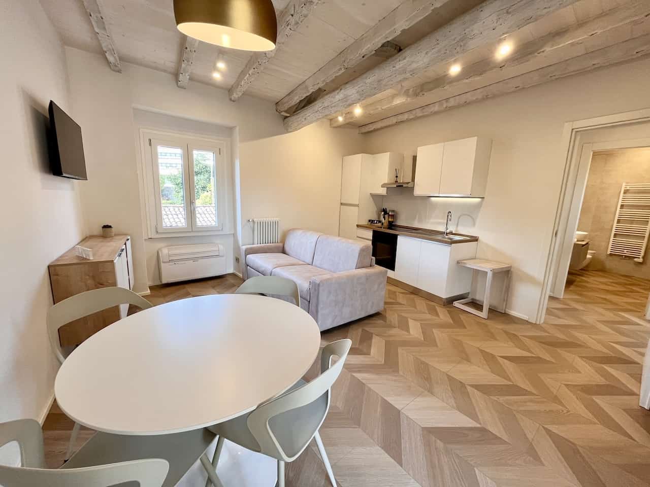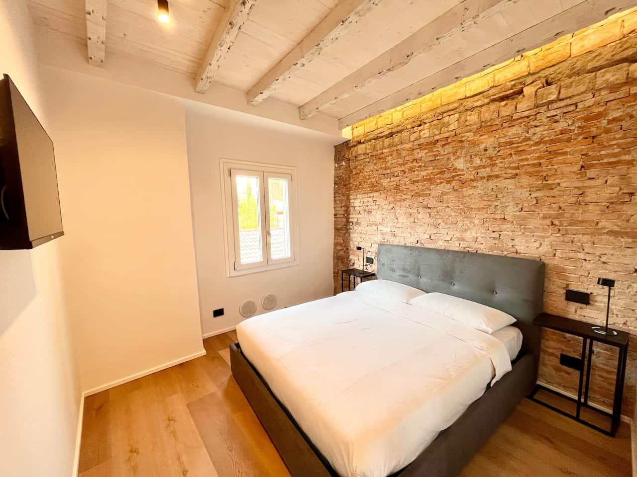 L’angolo cottura è completamente attrezzato con piano a induzione, frigorifero/freezer, forno e un set completo di utensili da cucina. La camera matrimoniale, con una parete rustica in mattoni, offre un letto a due piazze e una TV. Il bagno moderno è dotato di vano doccia, bidet, wc e lavabo, insieme a un asciugacapelli.