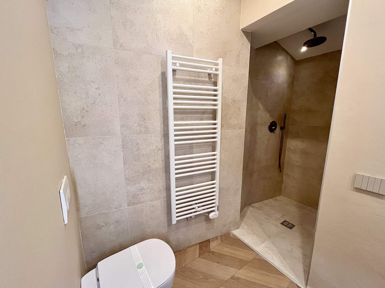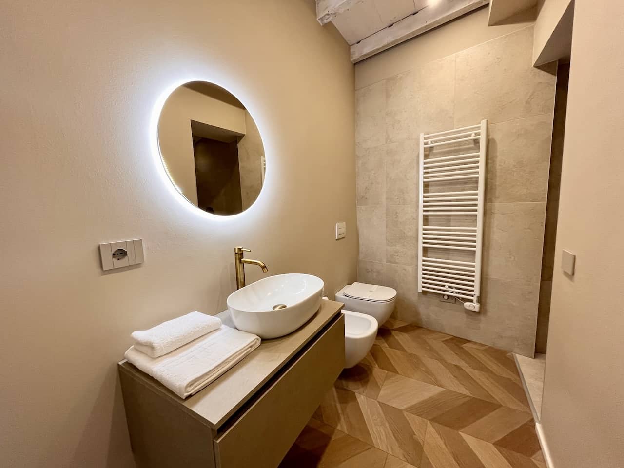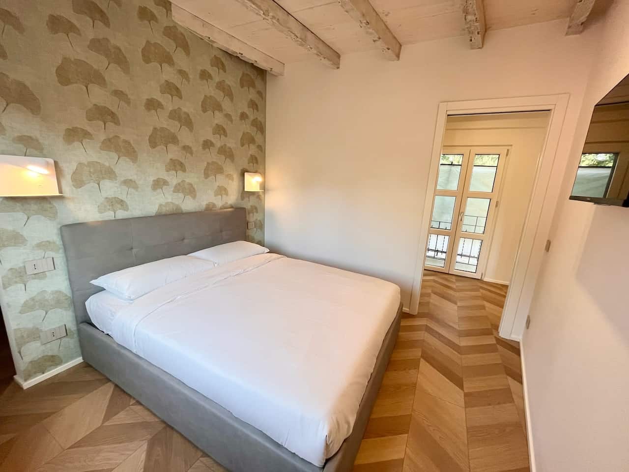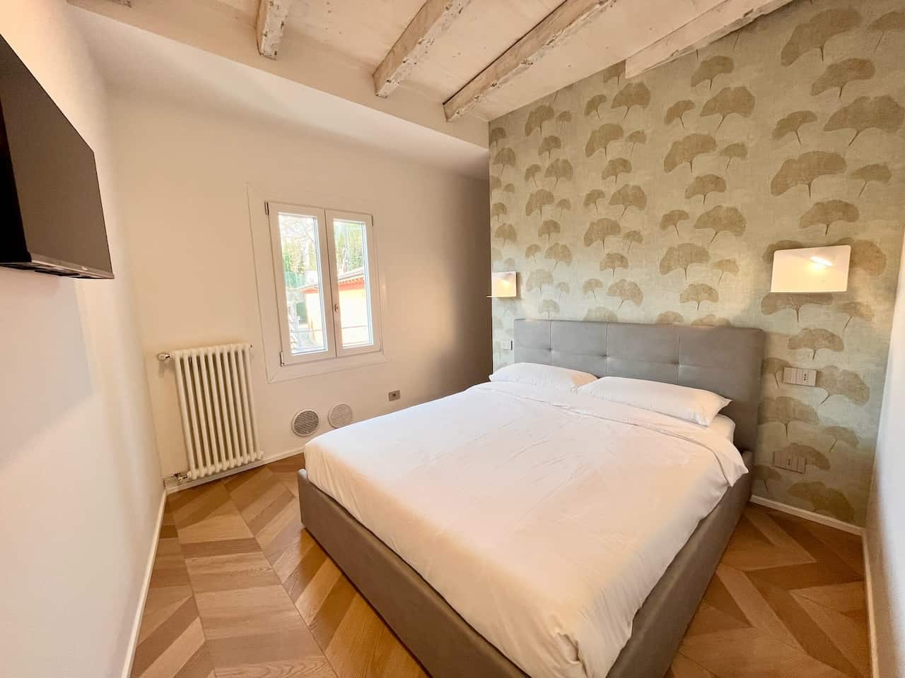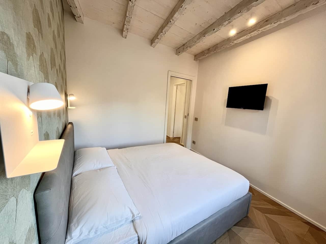 L’angolo cottura è completamente attrezzato con piano a induzione, frigorifero/freezer, forno e un set completo di utensili da cucina. La camera matrimoniale, con una parete rustica in mattoni, offre un letto a due piazze e una TV. Il bagno moderno è dotato di vano doccia, bidet, wc e lavabo, insieme a un asciugacapelli.