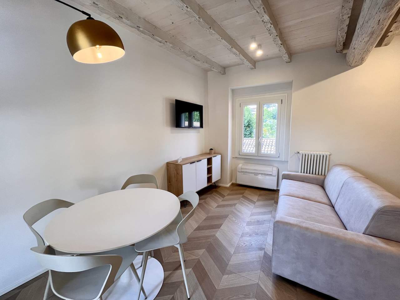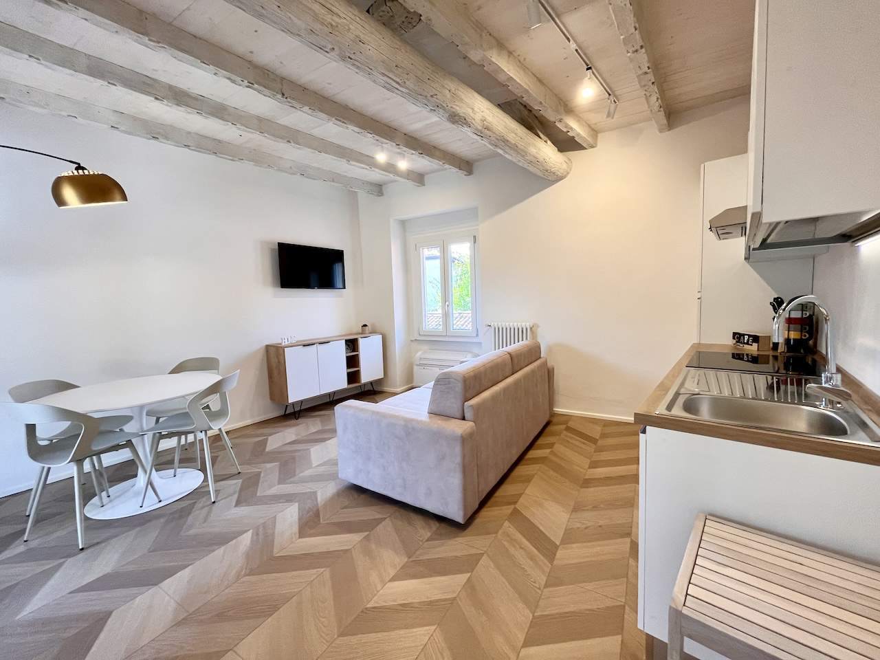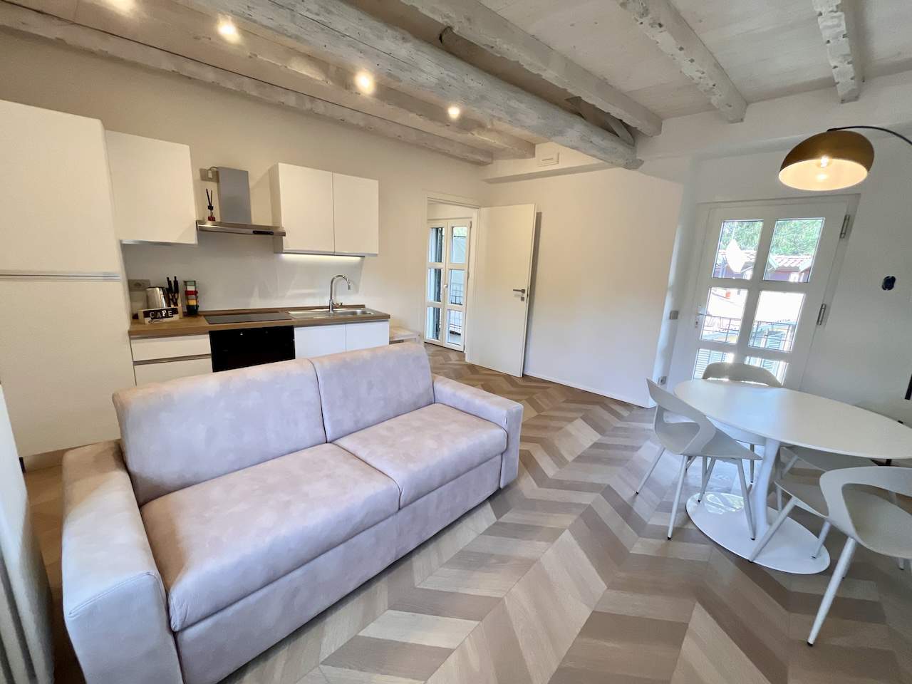 Situato al secondo piano di un complesso condominiale senza ascensore, l’appartamento accoglie i visitatori con un ingresso che riflette la modernità attraverso il parquet a spina di pesce. La zona soggiorno è dotata di una Smart TV HD con digitale terrestre, connessione Wi-Fi, tavolo da pranzo adatto anche per lo smart working, angolo cottura e un comodo divano letto per due ospiti.