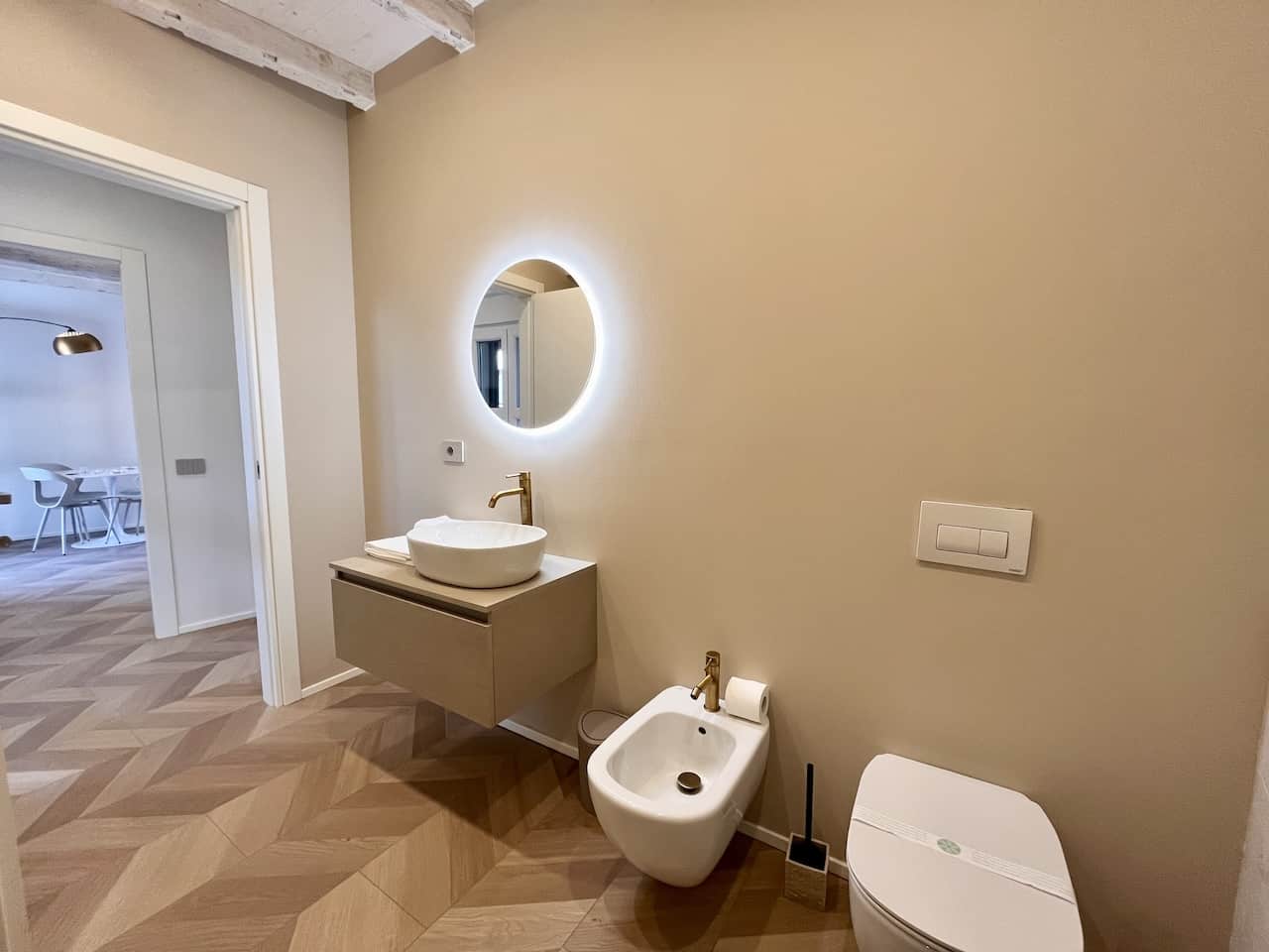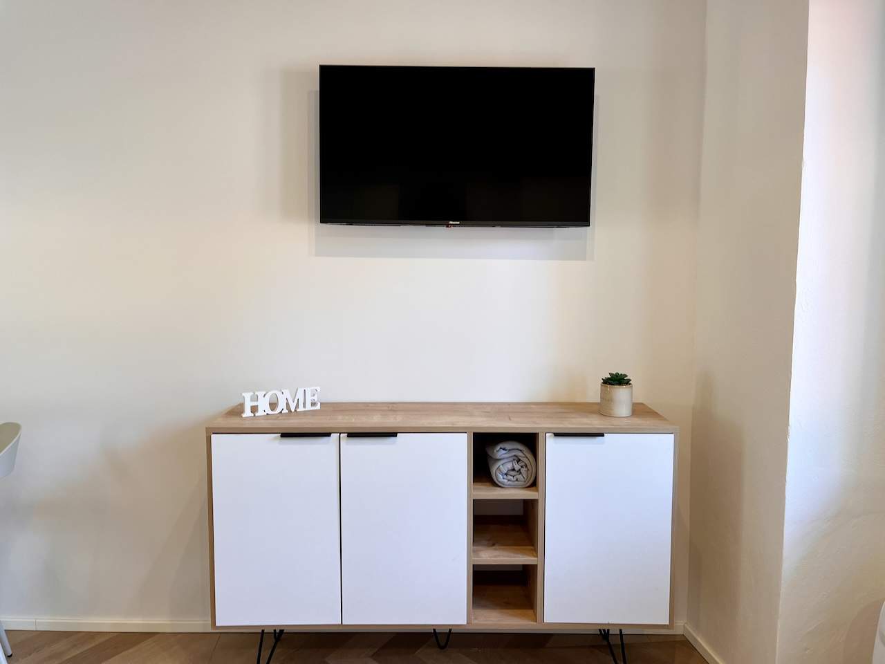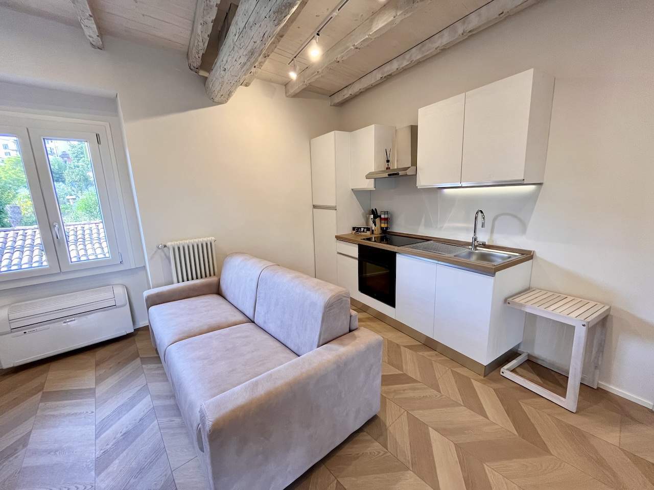 Situato al secondo piano di un complesso condominiale senza ascensore, l’appartamento accoglie i visitatori con un ingresso che riflette la modernità attraverso il parquet a spina di pesce. La zona soggiorno è dotata di una Smart TV HD con digitale terrestre, connessione Wi-Fi, tavolo da pranzo adatto anche per lo smart working, angolo cottura e un comodo divano letto per due ospiti.